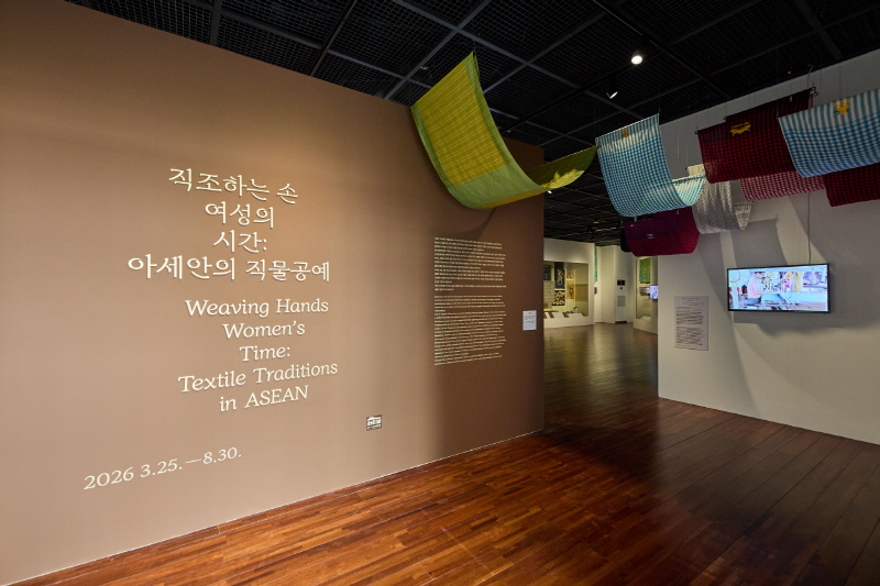 KF아세안문화원 기획전시 〈직조하는 손, 여성의 시간: 아세안의 직물공예〉는 아세안 지역의 직물공예를 통해 여성의 손과 시간이 빚어낸 삶의 풍경과 공동체의 기억을 조명하는 전시입니다. 동남아시아의 직물은 섬유 채집에서 방적, 염색, 직조에 이르는 오랜 과정을 통해 각 지역의 역사와 정체성을 담아왔습니다. 특히 캄보디아의 크라마, 동티모르의 타이스, 말레이시아의 송켓, 라오스의 나가 모티브 직조 전통, 필리핀의 피냐 직조 전통과 같이 유네스코 인류무형유산에 등재된 직조 전통은 아세안 직물공예가 지닌 세계적 문화 가치를 보여줍니다. 또한 바틱과 밀납 방염직물, 그리고 2024년 동남아시아 5개국이 공동 등재한 케바야 전통은 색과 문양, 복식문화가 국경을 넘어 서로 연결되어 왔음을 드러냅니다.